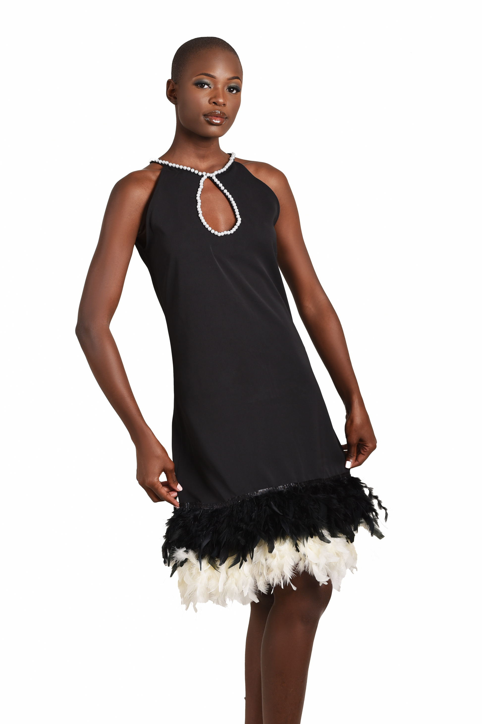 Pearl Feather Mini Dress - Adone yourself in pearl magic in the PEARL feather dress embodying grace and sophistication for the ultimate chic look .Made out of polyester fabric ,feathers at the bottom of the dress and pearls around its neckline