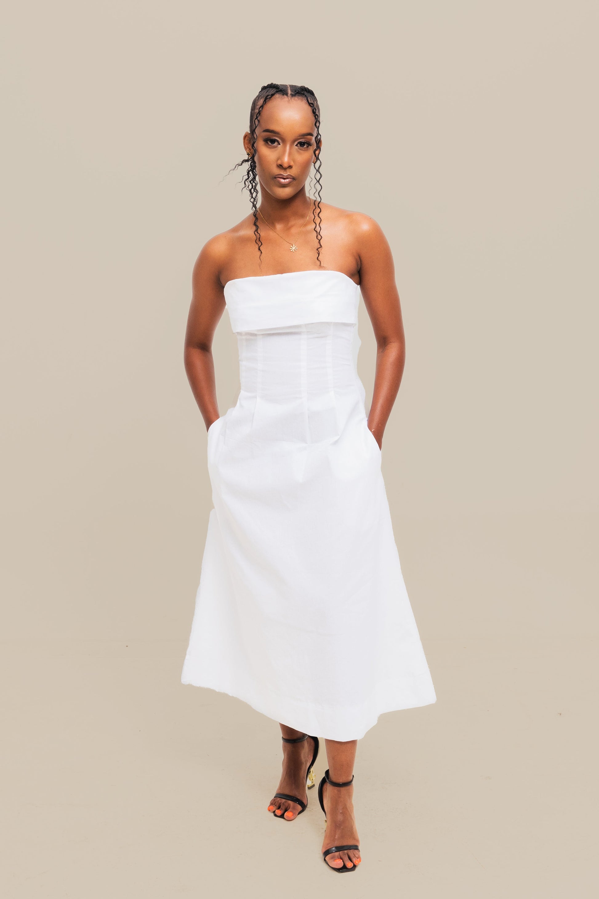 VELORA midi in white features a strapless bustier tube dress that's very chic with minimal touches to it accentuating your shoulders for a tan moment.
